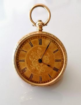 A fin de siècle key-wind gold fob watch with embossed decoration, Roman numerals, dial 35mm, brass dust cover, Swiss mechanism, in working order with both keys, stamped 14k and with French hallmark, 36.35g