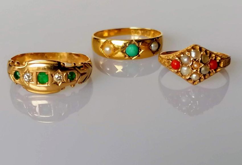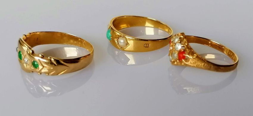 An 18ct yellow gold gypsy ring of tapering form, , 2.39g; a 15ct yellow gold ring with seed pearl and coral decoration, 1.61g, both hallmarked and another unmarked with diamond and emerald decoration, 3.53g sizes P, J, O (3)