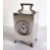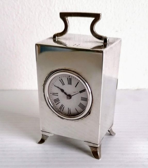 An Art Deco silver cased miniature clock with Roman numerals, swing handle on splayed feet by Hasset & Harper Ltd., Birmingham, 1945, 9 h x 4.5 w cm including handle, winder faulty
