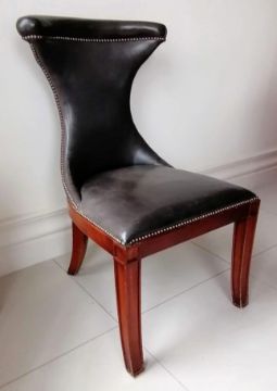 A set of six leather upholstered Ralph Lauren Polo dining chairs, each 96 cm H and labelled. Condition: light wear from ordinary use. Note: this lot can be collected, by arrangement, from a property in Virginia Water, GU25