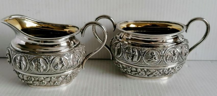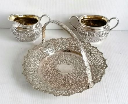 A colonial Indian silver two-handled sugar bowl, matching cream jug and tongs stamped silver and a white metal Indian swing handle basket with profuse pierced decoration, repaired (see extra photos), 22 cm diameter, 615g