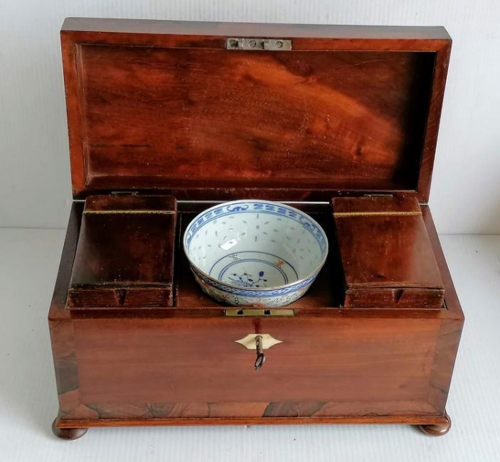 A Georgian mahogany and rosewood crossbanded tea caddy with ivory escutcheon, fitted interior with replacement bowl, on bun feet, with key, 16 h x 33 w x 17 d cm in very good condition