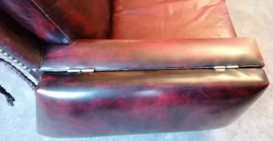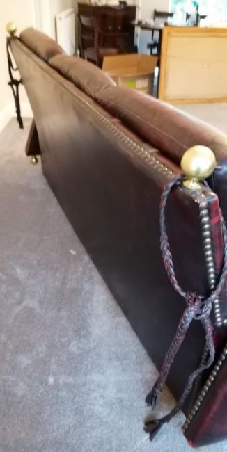A vintage Knole three-seat drop arm sofa upholstered in red studded leather, 102 h x 230 w x 90 d cm, in good condition, light wear from ordinary us. Note: this item will be collected, by arrangement, from a property in the Sandhurst area GU47