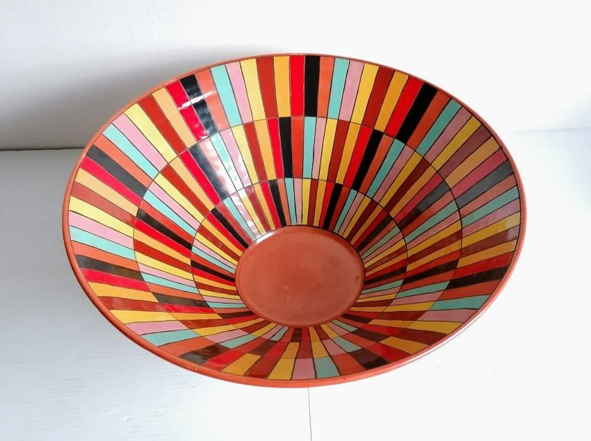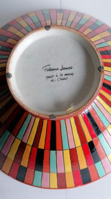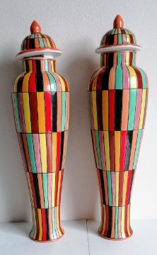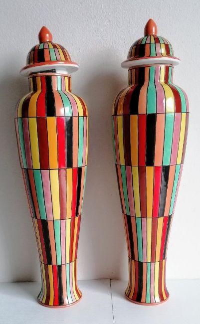 A pair of tall, slender Fabienne Jouvin lidded jars, each 39 cm and a matching conical bowl, 16 cm H x 40 cm diameter with hand-painted multicoloured block design, all without damage or repair (2)