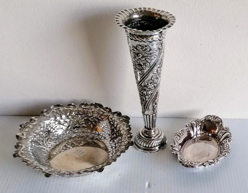 A weighted late Victorian silver specimen vase with rococo decoration by William Comyns, London, 1900, 19 cm H; a similar pierced circular bowl by Atkin Brothers, 3.5 x 14 cm, initialled; an oval pin dish by Dixon & Sons, 12 x 8.5 cm, both Sheffield, 1893, 1897, 181g of weighable silver (3)