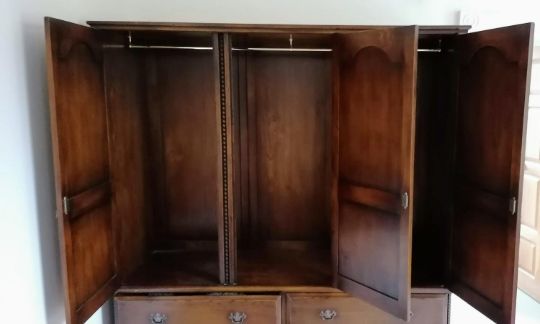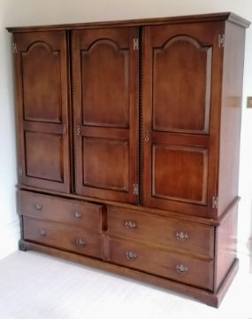 A Harrods Royal Oak Furniture three-door cupboard with drawers under, fitted for hanging, 196 h x 186 w x 63 d cm, in very good condition. Note: this lot can be collected, by arrangement, from a property in Virginia Water, GU25