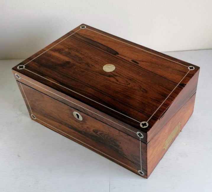 A 19th century rosewood writing slope with mother of pearl string inlay, recessed brass handles, secluded drawer, ink bottles and fitted interior, with key, 16.5 h x 35.5 w x 23.5 d cm, some veneer lifting, see extra photos, otherwise in very good condition