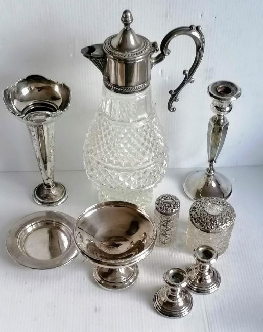 An assortment of late Victorian and Edwardian silver to include a pair of dwarf candlesticks, vase, single candlestick, tazza, all weighted; a pin tray, two silver-topped dressing table jars, mixed dates/makers together with a silver plate-topped claret jug