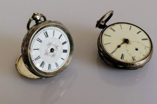 A French silver fin de siècle ladies fob watch with embossed case and a similar George V silver pocket watch, Birmingham, 1926, both as found (2)