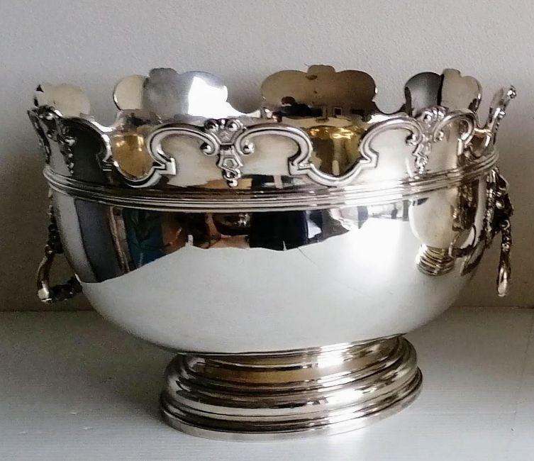 A Victorian silver monteith punch bowl with moulded rim, lion mask handles on a stepped pedestal foot by Daniel & John Wellby, London, 1899, 20 h x 28 diameter cm, 1584g, in very good condition. Note the next lot is a close match.