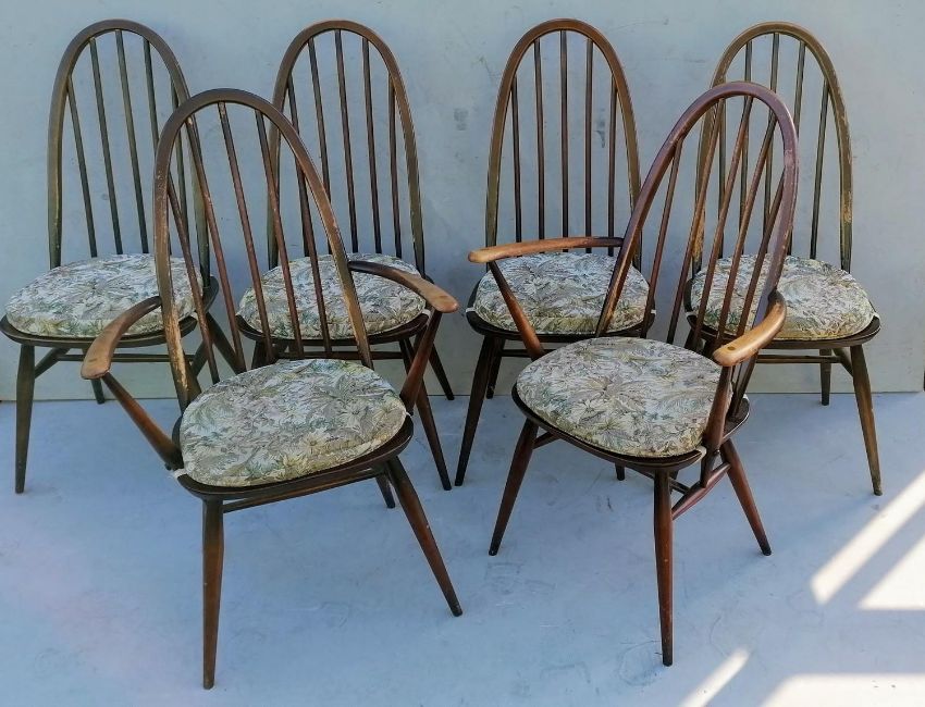 A set of six (4+2) Ercol blue label elm and beech spindle-back Quaker Windsor dining chairs, structurally in good condition, light wear from ordinary use