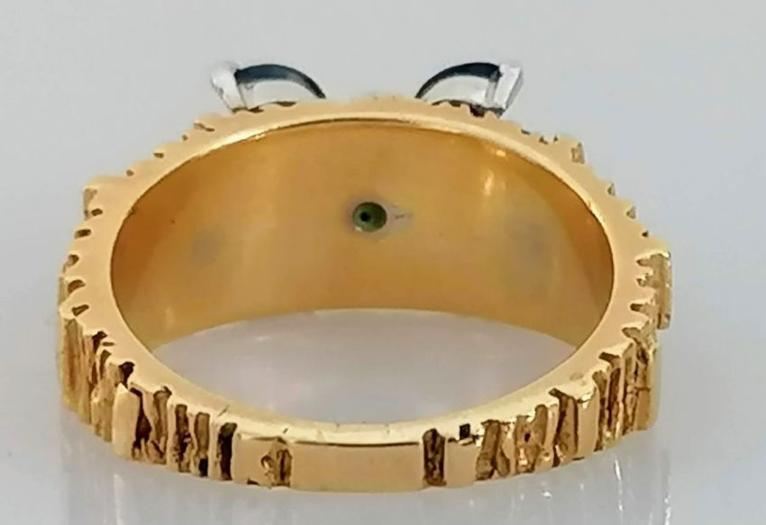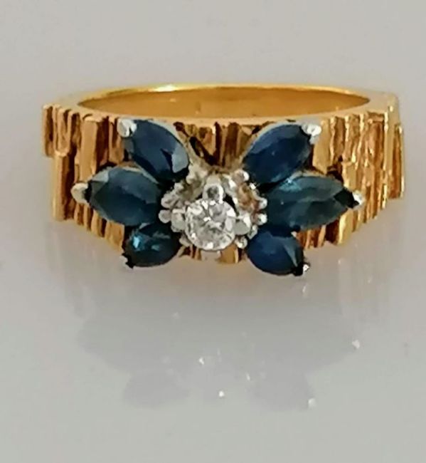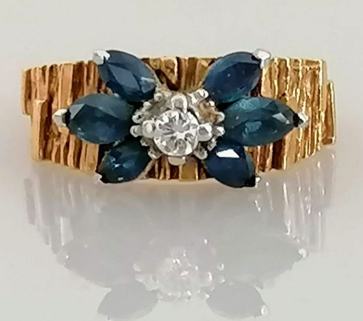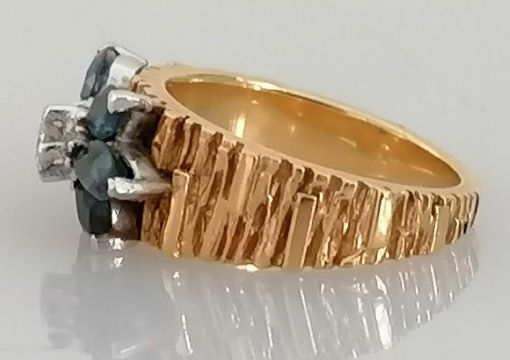 A mid-century gold, diamond and sapphire ring with textured shank, round brilliant-cut diamond 0.01 carats, size L, unmarked, tests for 14ct gold, 8.1g