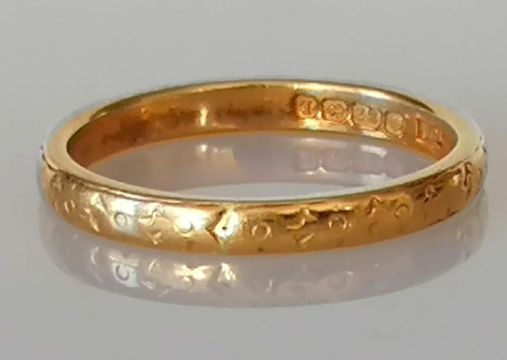 A 22ct yellow gold wedding band with etched decoration, hallmarked, size P, 4.1g