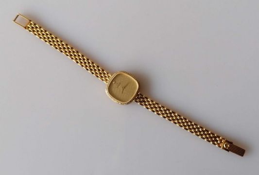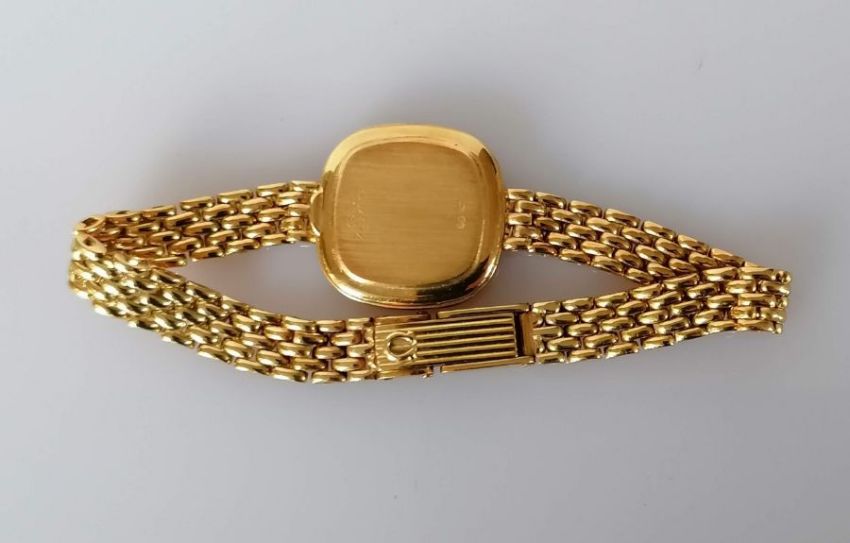 A vintage Omega ladies quartz 1387 wristwatch, circa 1990, with square striped face, 17mm, sword hands, diamond feature, bezel decorated with 64 round-cut brilliant diamonds, signed to face, mechanism and case with 18ct yellow gold integrated strap, 15 cm, Swiss hallmarks, 27.8g without mechanism, with Omega box