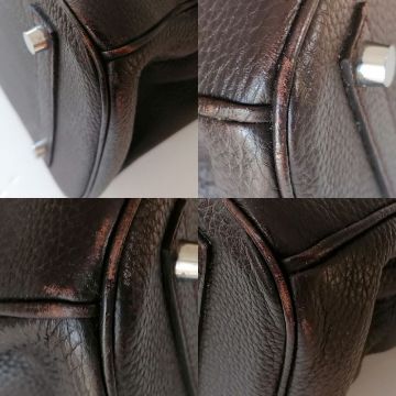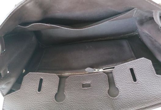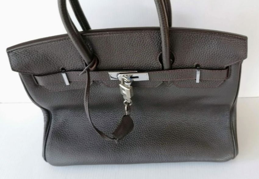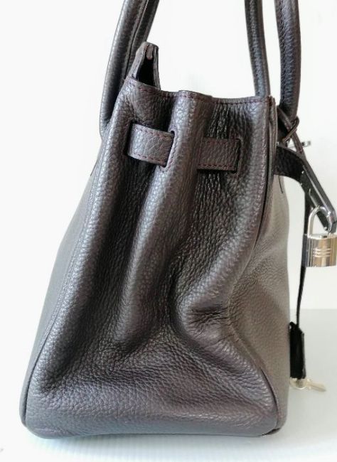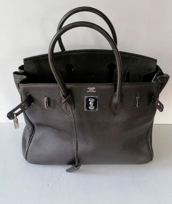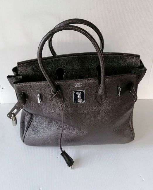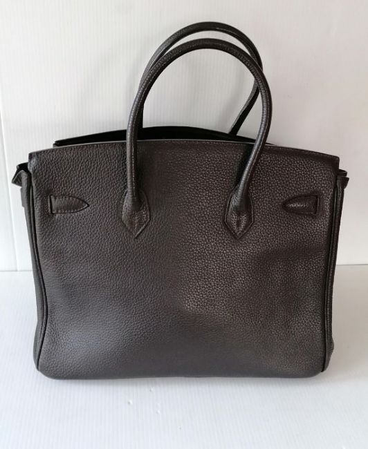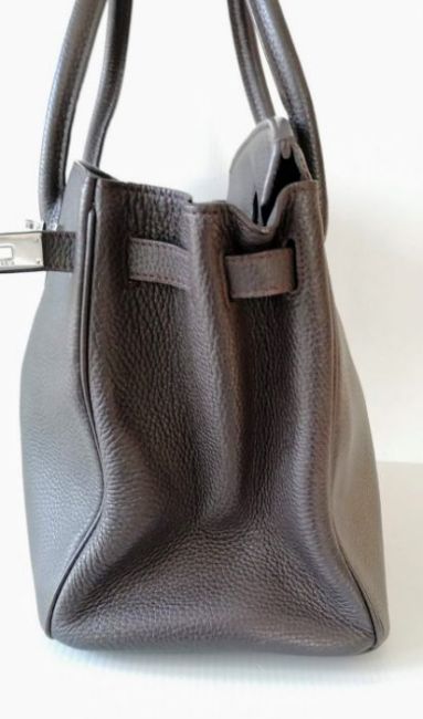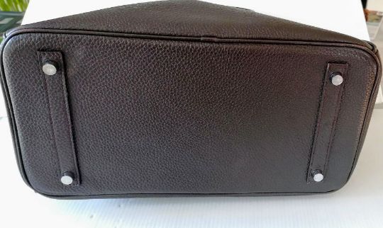 A Hermes-style Birkin 30 bag in chocolate brown leather, double handles, silver hardware, flap closure, lined interior, stamped 73A J to underside of strap, in good condition, light wear from ordinary use, 22 h x 30 w x 15 d cm, no dust bag, see extra photo for detail. Note: This bag is available for inspection at Wokingham, by appointment only, by calling 07446 802450