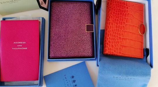 An Aspinal nail kit in fine leather, unboxed; a leather Smythson Panama Jotter, some pages used, with dust bag, a leather passport holder an address book; a Penhaligon travel clock and scented candle, both is leather cases all with original boxes/packaging (6)