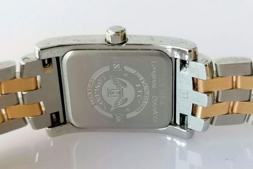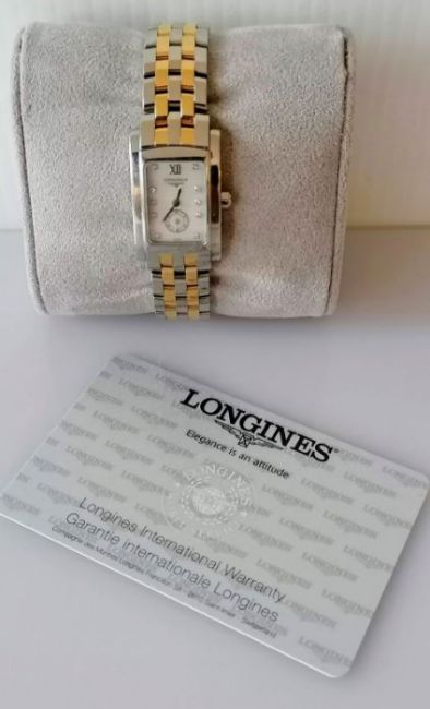 A Longines Dolcevita ladies diamond watch, white face 18mm, sword hands, subsidiary seconds hand, stainless steel case and two-tone strap, sapphire crystal, with guarantee card, purchased in 2011, not in working order, no box
