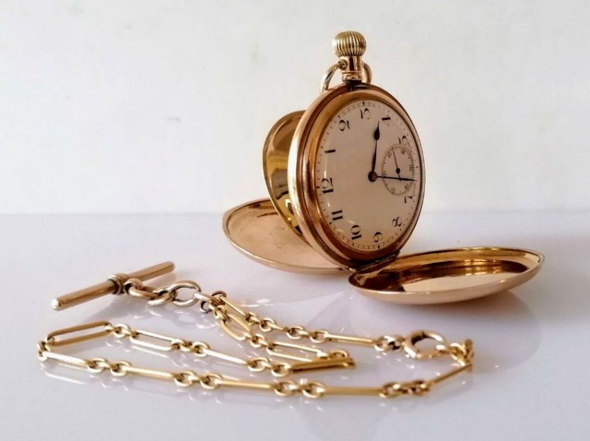 A George V gold full hunter pocket watch by Dennison with Swiss made Zenith movement, Arabic numerals, subsidiary seconds hand, gold dust cover, stem-wind, dial 38mm, case 50mm, in working order, gross weight 75.5g and a 9ct gold Albert chain by John Grinsell & Sons, 28 cm, 15.3g, both hallmarked 9ct (2)