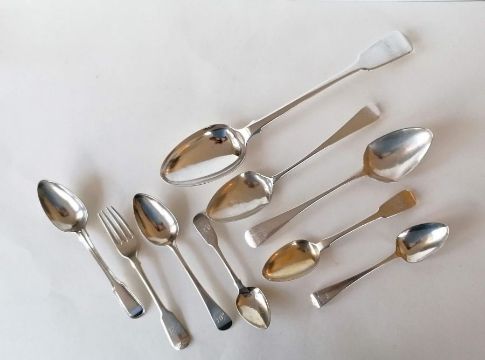 A William IV silver fiddle pattern basting or stuffing spoon by William Eaton, London, 1830, 30.5 cm, in very good condition; two Georgian silver table spoons, damage to bowls, each 22 cm; four Georgian silver dessert spoons a fork and teaspoon, mixed dates/makers, 445g