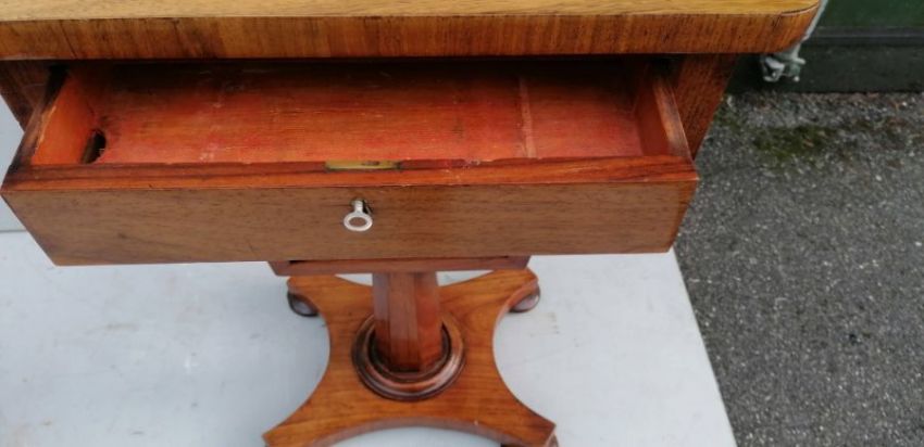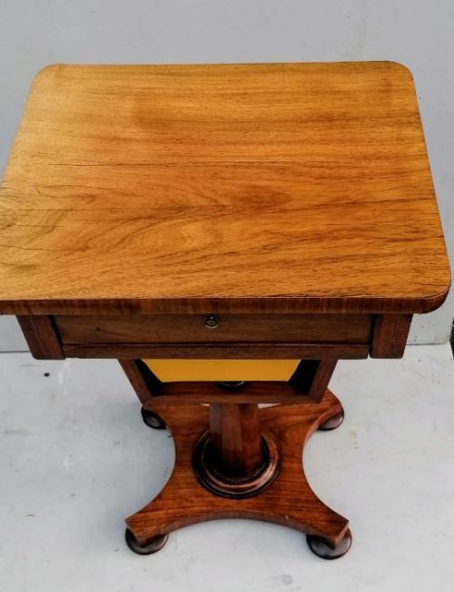 An early Victorian mahogany ladies work table with single drawer on an octagonal support and platform base, 74 h x 47 w x 39 d cm