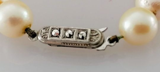 An Art Deco cultured pearl necklet comprising forty-three Akoya beads measuring 7.9mm to 8.5mm on a marcasite and silver clasp, stamped, 40 cm, 34.37g. Pearls cream, medium pitting, fair lustre with insurance valuation dated 2014 for £700