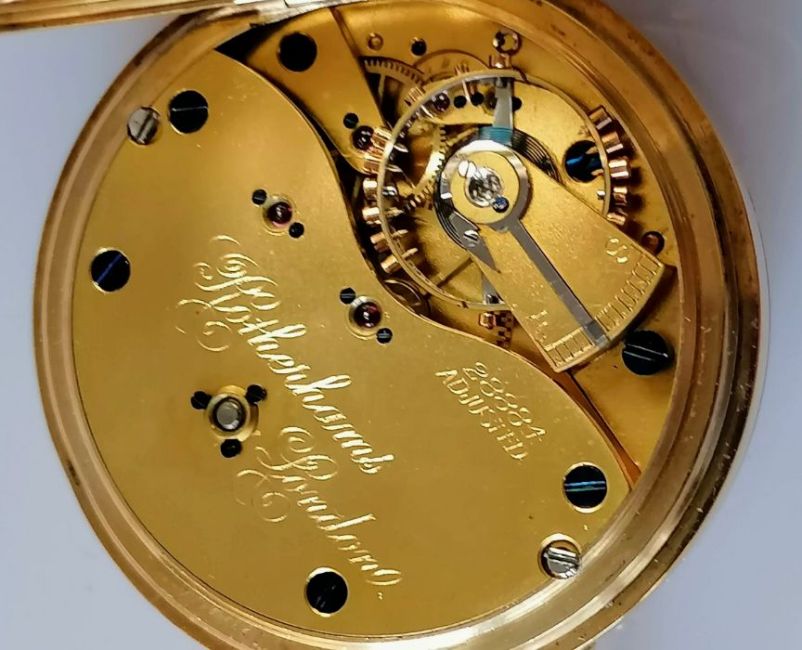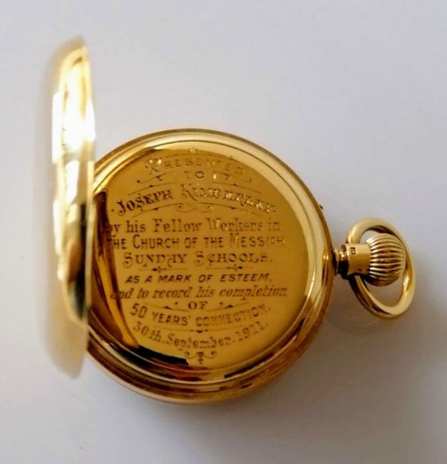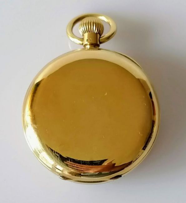 An Edwardian open-faced stem-wind gold-cased pocket watch with white enamel dial signed Rotherhams, London, black Roman numerals, subsidiary seconds dial, inscription to the inner cased dated for 1911 and hallmarked 18ct for Birmingham, 1904, case diameter 50mm, not in working order, 117g