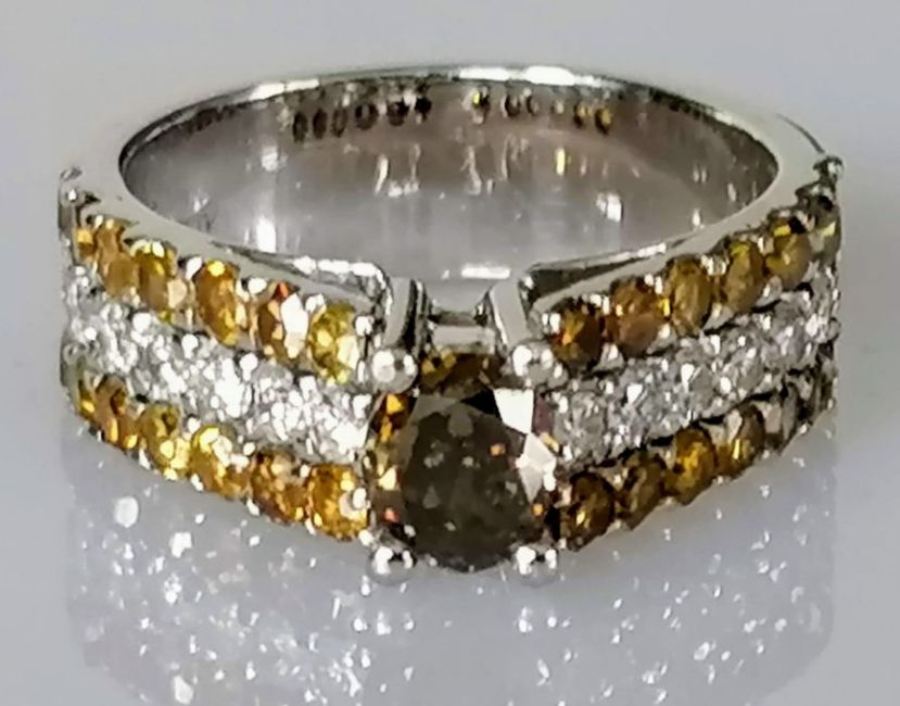 A diamond ring, the central yellowish brown diamond measuring an estimated 5.93 x 5 x 3.2mm, weighing an estimated 0.60 carats with three rows of white diamonds to each shoulder: a central row of fourteen white diamonds, estimated diamond weight 0.70 carats, estimated colour I-J, clarity I1-I2; a row of fancy yellowish brown diamonds either side, estimated diamond weight 1.55 carats, clarity I2-I3, stamped 750, 7.95g