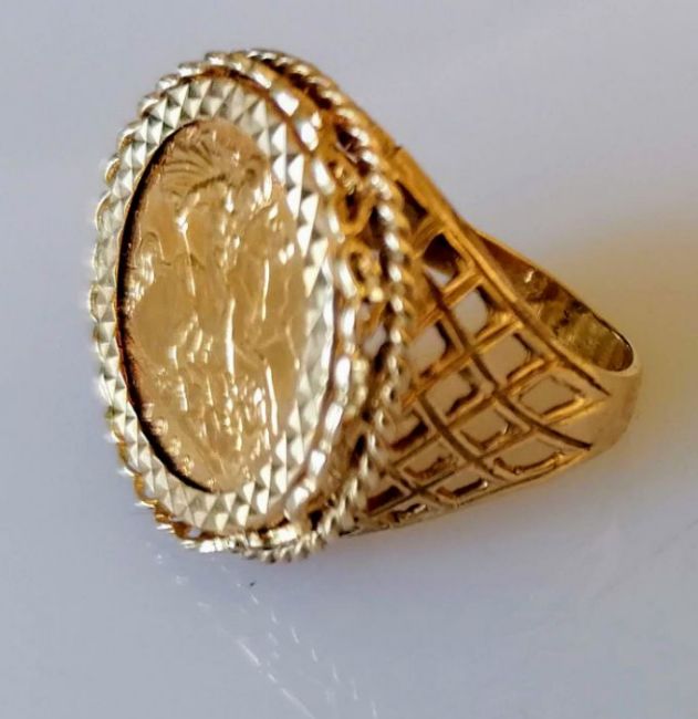 A mounted gold half sovereign ring, dated 1982, with pierced decoration, hallmarked 9ct, 8.78g