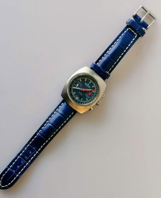 A Breitling Datora Chronograph 34 manual wristwatch, early 1970's, with stainless steel case, serial no. 1409255, signed blue face two-register chronograph, signed to case, 38 x 45mm, light scratches to crystal and crown, later strap in working order at present, no original box or papers