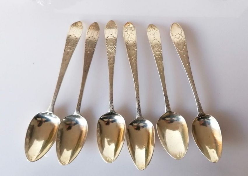 Three Georgian Irish silver bright-cut teaspoons by Law & Bayly, one similar by William Ward and John Shiels and one with no maker's mark, all 1790's, 13.5 cm and a harlequin three-piece condiment set, mixed dates/makers