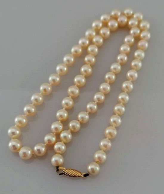 A single row of sixty-one cultured pearls, measuring 6mm to 6.3mm, medium cream colour on a lozenge-shape gold clasp, 21.36g, 42 cm with a SafeGuard insurance valuation dated 2014 for £585