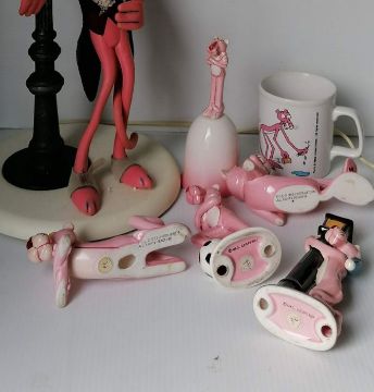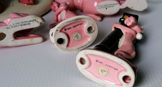 A collection of UAC Geoffrey and United Artists ceramic Pink Panther models in various poses, lamp (hat missing) and PP mug, all without damage or repair