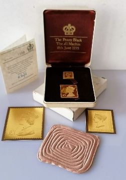 The British Definitive Stamp Replica Issue; 22ct gold replica The Penny Black and the £1 Machin, 18th June 1973, with CoA no. 0498, fitted in original box and packaging, 38.2g