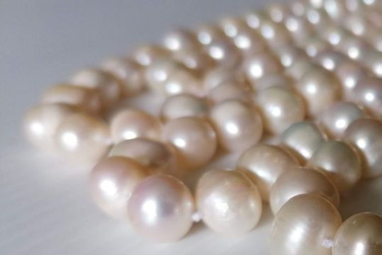 An opera length single strand of cream cultured pearls, each approximately 11mm, 200 cm; a pearl necklet, two malachite necklaces and a matching bracelet (5)