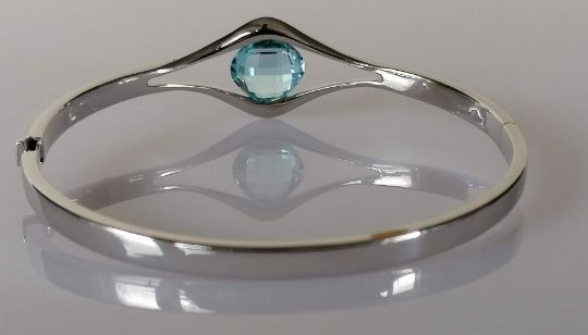 A white gold bangle with split shank enclosing a blue topaz, 12.80 carats, and diamond decoration, Cyprus assay marks for 18ct gold, 11.3g