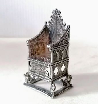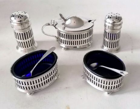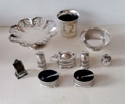 An Edwardian silver miniature throne by Adie & Lovekin Ltd, 1910, 5.5 cm H; a George V five-piece matching silver cruet set with pierced decoration, blue glass liners and conforming spoons by Adie Brothers, all 1924, both silver and glass in very good condition; a silver tazza with pierced gallery, 5 h x 10 diam. cm, also by Adie Brothers, 1923; and another silver tazza by Viners, Sheffield, 1940, 6 h x 16 cm dial.; a Childs rattle, maker's mark rubbed, all Birmingham and a French silver plated christening beaker with etched fern decoration and inverted rim, initialled cartouche, 7.5 cm H