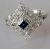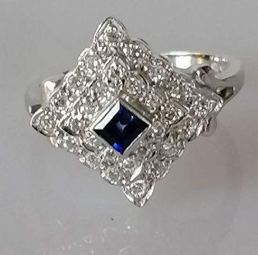 A diamond and sapphire parure on 18ct white gold featuring a square cluster ring with 28 round brilliant-cut diamonds, approximately 0.30 carats in total, surrounding a princess-cut sapphire, 3 x 3mm, size L, with a pendant and pair of earrings of similar size, all stamped 750, 15g (3)
