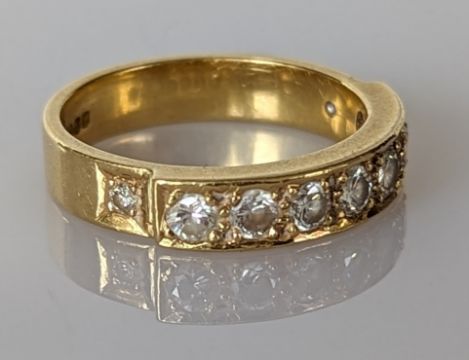 A seven-stone diamond and gold ring in a channel setting, each diamond approximately 0.10 carats with two smaller diamonds either side, each approximately 0.05 carats, size N, hallmarked 18ct, 4.9g