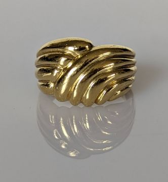 An 18ct yellow gold ring with fluted decoration, stamped 750, size M, 8.4g