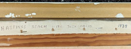 Robert William Hill (1932-1990), HASTINGS BEACH WITH DECKCHAIRS, oil on canvas, dated 1979, 50 x 75cm, framed, signed top left