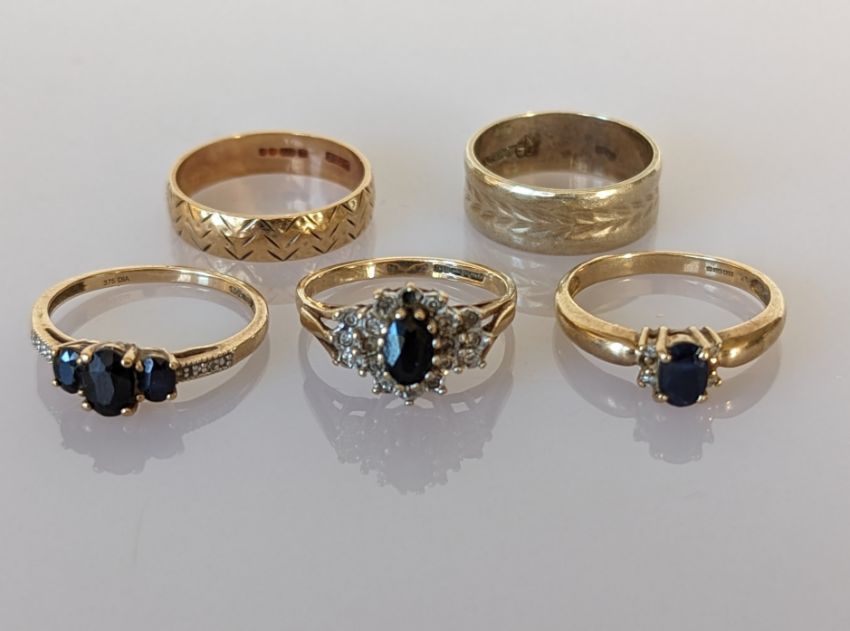 Three sapphire and diamond rings and two etched gold bands, all hallmarked 9ct gold, mixed sizes, 13.2g (5)