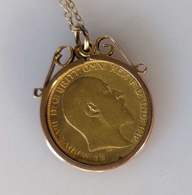 An Edwardian gold half sovereign in a gold mount and chain, both stamped 9ct, 6.2g