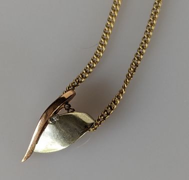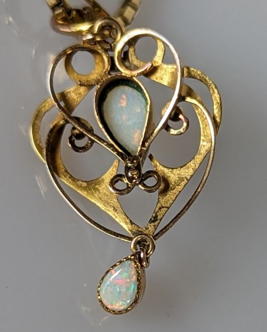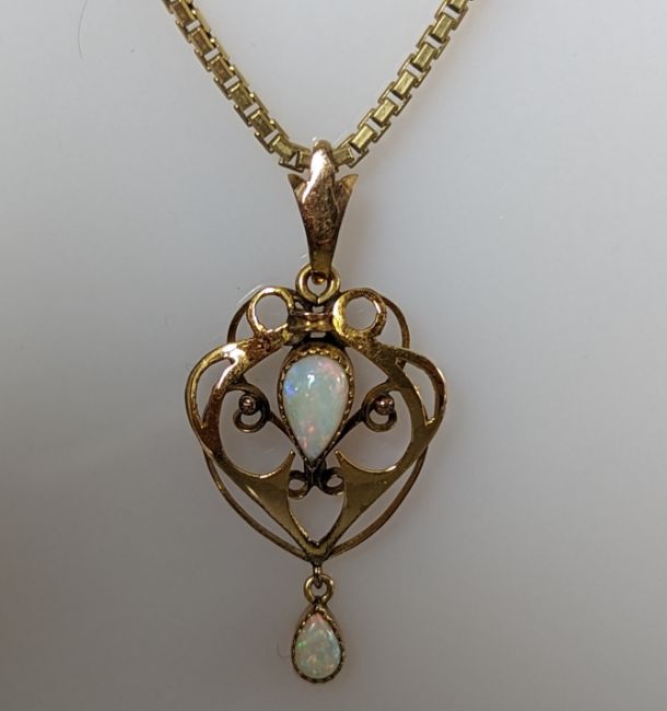 An Art Nouveau yellow gold and opal carved pendant chain, 40mm, chain 53 cm and two other pendant chains, all hallmarked 9ct, 26.6g (3)