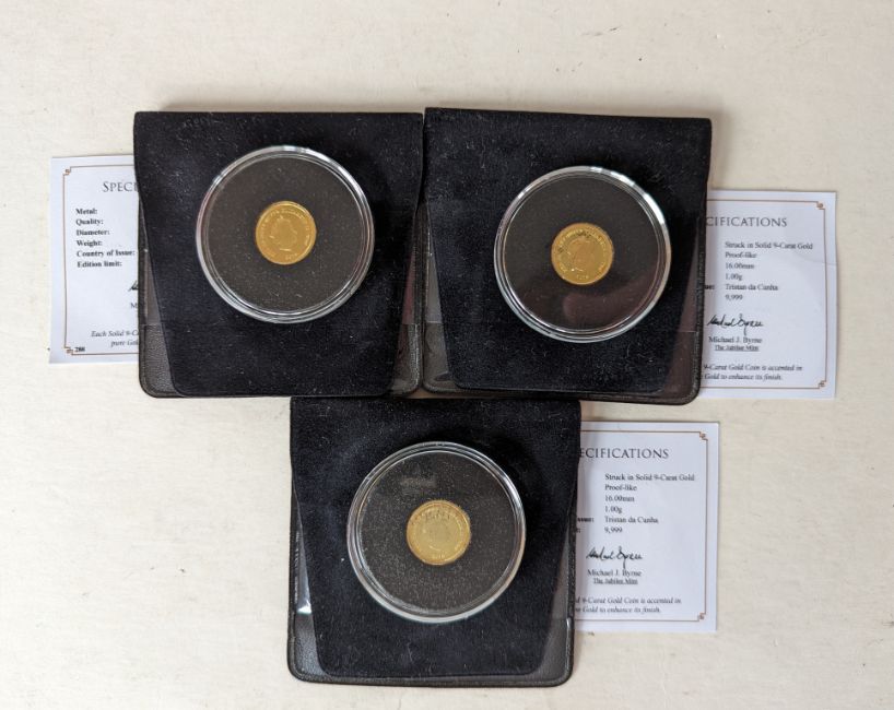 Three Tristan da Cunha 2015 9ct gold coins, each 1g and with COA (3)