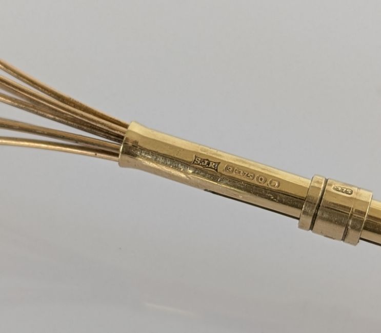 A 9ct yellow gold swizzle stick, hallmarked for Stephen J Rose, London, 1951, 7 cm closed, in good condition, initialled